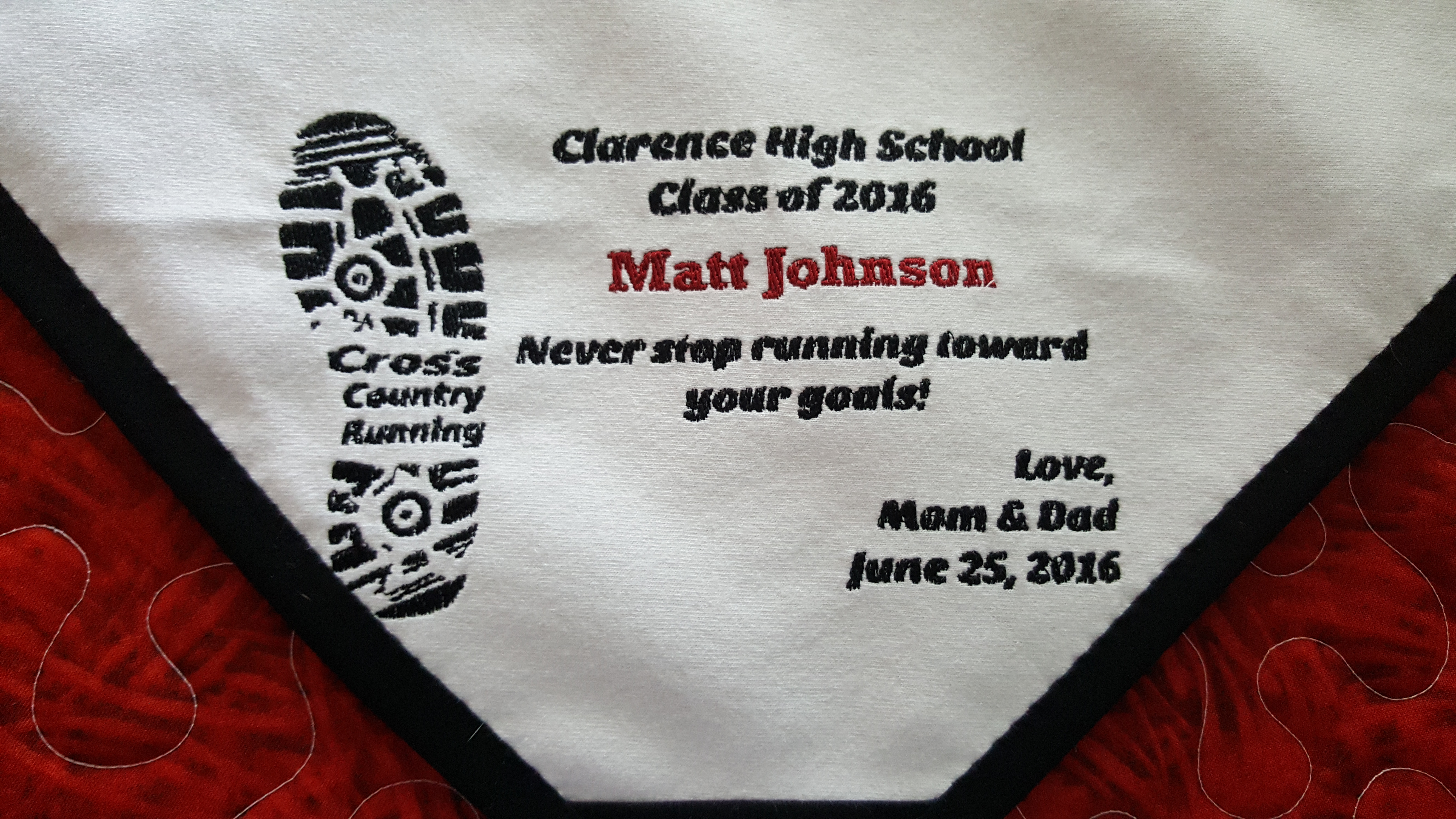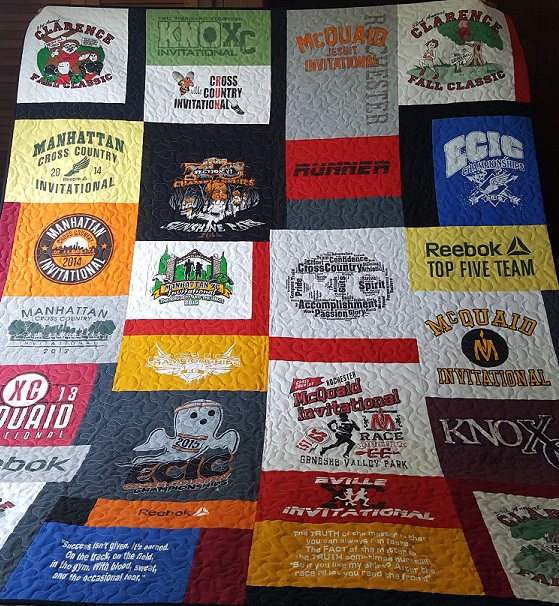 MJohnson T-Shirt Quilt 2016 I was hired to make a T-shirt quilt to commemorate a young man’s high school cross country career. The quilt was gifted to him by his parents as a graduation gift and went off to college with him in the fall of 2016. Full Quilt with edge to edge stippling Label